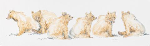 Drie vlinders fladderen boven een beer die net overeind gekomen is. Ondanks hun indrukwekkende kracht, zijn beren heel speels, nieuwsgierig naar alles en nog wat, en doen ze vaak denken aan grote knuffelbeesten.